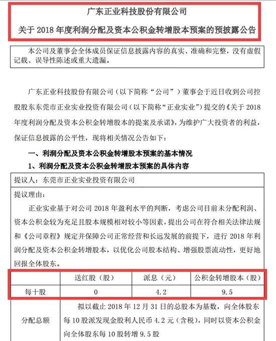 正業(yè)科技公告,2018年度擬10轉9.5派4.2元(含稅),并預計今年利潤在2.17-2.77億元之間,同比增10%-40%。