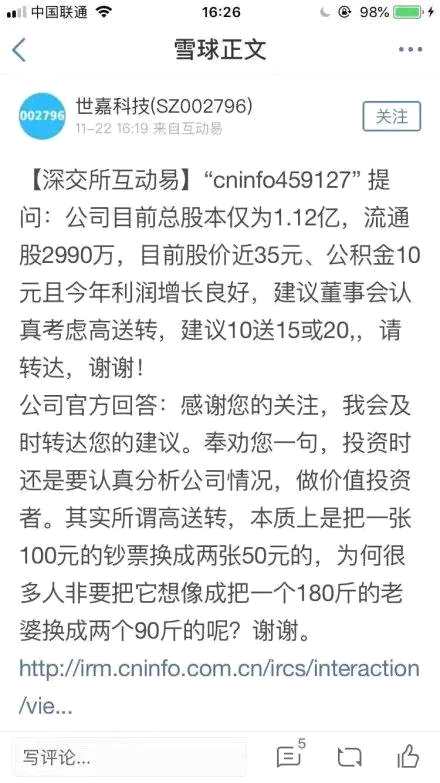 不過基金君還是要提醒大家,對于高送轉的炒作要謹慎。正如世嘉科技的董秘所稱,高送轉的本質就是把100的鈔票換成兩個50的,為何把它想像成把一個180斤的老婆換成兩個90斤的呢?
