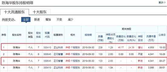 而截至9月30日,陳海華就只進了這兩家公司的前十大流通股東名單,可謂是壓中率100%。