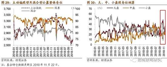 ? 基金持倉方面,股票型、混合型基金整體倉位(11月22日)分別較前一期(11月15日)小幅下降1.99%、1.73%至88.68%、79.65%。大盤股倉位較前一期上升5.75%至28.58%;中盤股倉位較前一期下降4.43%至21.15%,小盤股倉位較前一期下降3.06%至27.94%。