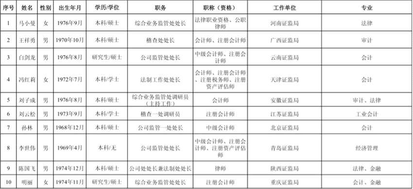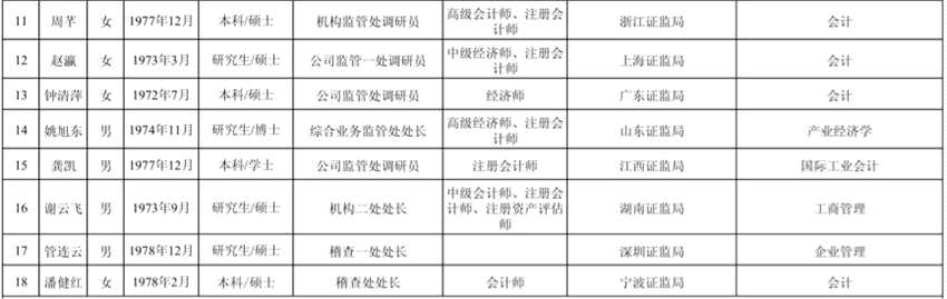 18名來(lái)自證監(jiān)會(huì)各地方證監(jiān)局的候選人: