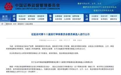 11月27日晚間,證監(jiān)會(huì)發(fā)布公告公示中國(guó)證券監(jiān)督管理委員會(huì)第十八屆發(fā)行審核委員會(huì)委員候選人名單。
