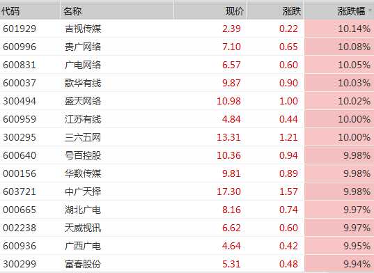 在吉視傳媒、貴廣網(wǎng)絡(luò)、【廣電網(wǎng)絡(luò)(600831)、股吧】、歌華有線一眾漲停股的帶動(dòng)下,申萬(wàn)傳媒板塊漲幅甚至超過(guò)了電子。