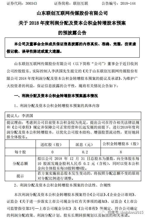 聯(lián)創(chuàng)互聯(lián)是第四家今年年報(bào)擬推大比例送轉(zhuǎn)的股票。此前三只股票分別是【正元智慧(300645)、股吧】、漢邦高科、正業(yè)科技。其中,正元智慧擬向全體股東每10股派發(fā)現(xiàn)金股利1.5元(含稅),同時(shí)以資本公積金向全體股東每10股轉(zhuǎn)增9股。漢邦高科擬向全體股東每10股派發(fā)現(xiàn)金股利0.7元,同時(shí)以資本公積金每10股轉(zhuǎn)增8股。正業(yè)科技擬向全體股東每10股派發(fā)現(xiàn)金4.2元(含稅),同時(shí)以資本公積金向全體股東每10股轉(zhuǎn)增9.5股。