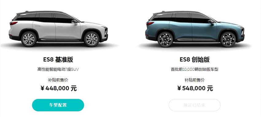 蔚來(lái)汽車(chē)官網(wǎng)顯示,ES8基準(zhǔn)版補(bǔ)貼前售價(jià)44.8萬(wàn)元,ES8 創(chuàng)始版補(bǔ)貼前售價(jià)54.8萬(wàn)元,蔚來(lái)ES6將于12月1日預(yù)訂,預(yù)售價(jià)37萬(wàn)元起。