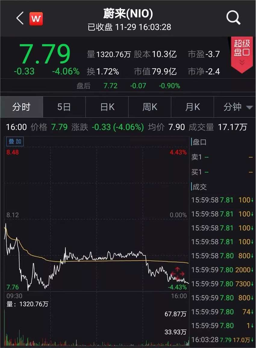 截至11月29日收盤(pán),蔚來(lái)汽車(chē)股價(jià)下跌4.06%,報(bào)7.79美元,伍絲麗辭職消息傳出后,盤(pán)后股價(jià)一度跌逾1%。