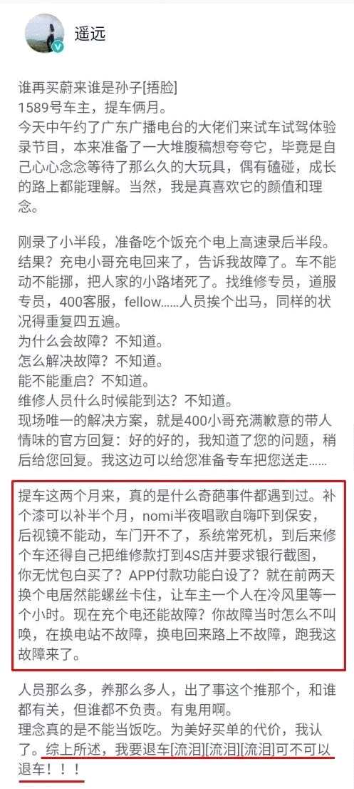 難忍故障多 蔚來(lái)首位“要求退車(chē)”用戶(hù)誕生