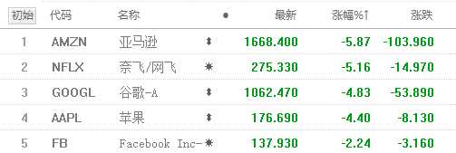 科技股依然是重挫主力,美股FAANG五大科技股全線下跌,亞馬遜、奈飛跌逾5%,谷歌、蘋果跌逾4%,F(xiàn)acebook跌2.24%,市值累計(jì)一日蒸發(fā)1400億美元。