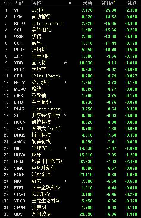 中概股多數(shù)收跌,1藥網(wǎng)大跌25%,凌動智行、優(yōu)信、拍拍貸等6股跌幅超過10%,嗶哩嗶哩、蔚來汽車、虎牙等25股跌幅超過6%,此外,百度跌4.53%,阿里巴巴跌3.3%,拼多多跌2.71%,京東跌2.54%。
