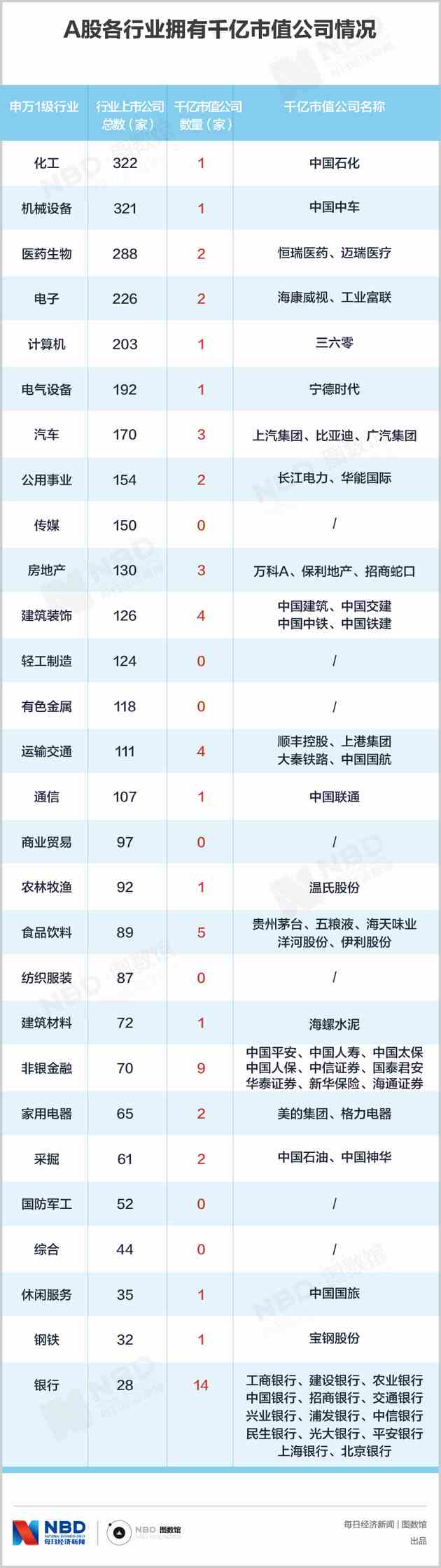 A股各行業(yè)擁有千億市值公司情況