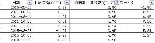 在道指單日漲幅超過3%的交易日,共出現(xiàn)8次,A股次日僅出現(xiàn)一次,為2010年5月,上漲概率高達86%,平均漲幅1.22%,中位數(shù)漲幅0.91%。