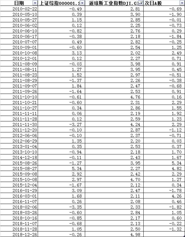 數(shù)據(jù)顯示,2010年以來,道瓊斯指數(shù)單日漲幅超過2%的交易日共有42個,次日A股下跌次數(shù)15次,上漲26次,上漲概率達63%,漲幅中位數(shù)為0.45%,次日漲幅超過2%的交易日7次,次日漲幅超過1%的交易日共15次,概率達36%。