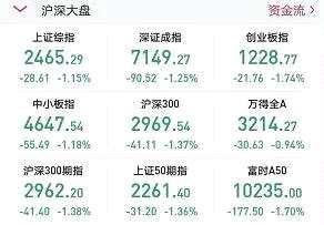 截至收盤,上證綜指下挫1.15%,收于2465.29點;深證綜指1.37%,創(chuàng)業(yè)板跌幅最大,下跌1.74%。