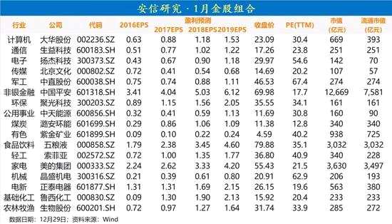按照尋找確定性開局的思路,建議從三個方面進(jìn)行1月份的配置:一是關(guān)注基建、通信、農(nóng)業(yè)、軍工等景氣度較高的板塊;二是關(guān)注食品飲料、中藥等必需消費品板塊;三是受益于政策松的銀行、地產(chǎn)。