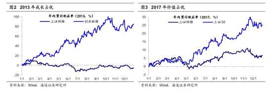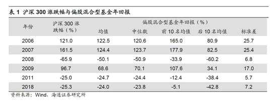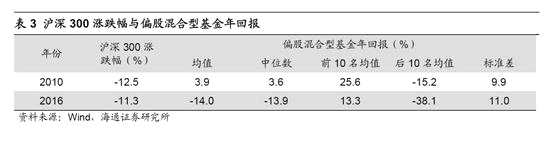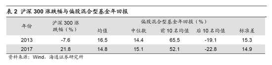 結(jié)構(gòu)年份:2013、2017。結(jié)構(gòu)年份多為整體震蕩市下的結(jié)構(gòu)性行情,如2013年成長占優(yōu),上證綜指全年漲跌幅-6.7%、創(chuàng)業(yè)板指82.7%,2017年價值占優(yōu),上證綜指全年漲跌幅6.6%、上證50 25.1%。與趨勢行情不同,結(jié)構(gòu)性行情下市場整體漲跌幅和基金業(yè)績表現(xiàn)偏離較大,如2013年滬深300漲跌幅-7.6%VS偏股混合型基金同年回報均值16.5%、2017年21.8% VS14.8%。同時由于基金配置風格不同導(dǎo)致基金內(nèi)部業(yè)績離散很大,2013、17年偏股混合型基金年回報標準差15.3%、14.9%,高于趨勢年份、節(jié)奏年份下標準差均值14.6%、10.4%。結(jié)構(gòu)年份下排名靠前的基金重在結(jié)構(gòu)配置而非倉位控制,如2013年排名前10 的偏股混合型基金配置明顯偏成長,前十大重倉股中TMT板塊數(shù)量占比55.6%,2017年排名前10的配置偏大盤藍籌,前十大重倉股中中證100成分股數(shù)量占比40.9%。