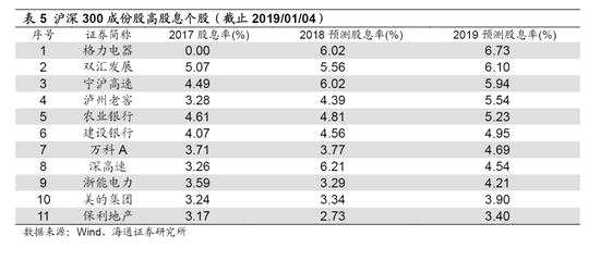 高股息策略求穩(wěn)。《策略專題-類衰退時期股市特征-20181218》提出宏觀背景看,2018年下半年經(jīng)濟呈現(xiàn)類滯脹特征,往后看經(jīng)濟增速下行仍將持續(xù),通脹周期滯后于增長周期,經(jīng)濟將由類滯脹走向類衰退,在此期間股市回落找市場底,高股息策略優(yōu)勢顯現(xiàn)。08/4-09/3和11/9-12/9經(jīng)濟都出現(xiàn)過類衰退特征,這兩段區(qū)間內(nèi)高股息類行業(yè)呈現(xiàn)明顯的超額收益。而且,在經(jīng)濟類衰退期,往往會降息,債券以及類債券特征的高股息股票將受益。根據(jù)行業(yè)分析師盈利預(yù)測,結(jié)合歷史分紅率預(yù)測股息,我們篩選滬深300成分中高股息率、穩(wěn)定分紅個股如表5。此外,以政策寬松為界,類衰退后期受益于政策寬松的行業(yè)表現(xiàn)更優(yōu),第一次類衰退后期,周期性行業(yè)受益于四萬億投資計劃,2008/09-2009/03期間建材漲跌幅78.8%、電力設(shè)備78.6%、有色73.3%、同期上證綜指19.5%。第二次類衰退后期金融改革持續(xù)利好,2011/12-2012/09券商漲幅11.8%,保險10.7%,同期上證綜指-10.6%。往后看政策寬松的方向在哪里?18年10月、12月中央政治局會議較7月底相比均未提及房地產(chǎn)調(diào)控,2018年中央經(jīng)濟工作會議對于房地產(chǎn)的定位是“構(gòu)建健康發(fā)展長效機制”,而2017年“保持房地產(chǎn)市場調(diào)控政策連續(xù)性和穩(wěn)定性”,如果2019年一季度經(jīng)濟數(shù)據(jù)持續(xù)下滑,不排除地產(chǎn)政策微調(diào)的可能,類似2012年初房地產(chǎn)政策開始微調(diào),地產(chǎn)行業(yè)指數(shù)跑贏上證綜指。行業(yè)分析師預(yù)計18/19年地產(chǎn)凈利潤同比增速分別為23%/8%,目前地產(chǎn)行業(yè)PB(LF,整體法)估值1.36倍,處于05年以來自下而上1%分位,若政策微調(diào),地產(chǎn)板塊受益。戰(zhàn)略性看好成長,政策再次偏向科技創(chuàng)新類,2018年中央經(jīng)濟工作會議明確提出“要推動先進制造業(yè)和現(xiàn)代服務(wù)業(yè)深度融合,堅定不移建設(shè)制造強國”,先進制造如5G產(chǎn)業(yè)鏈、新能源車產(chǎn)業(yè)鏈,服務(wù)消費如醫(yī)療健康、保險。