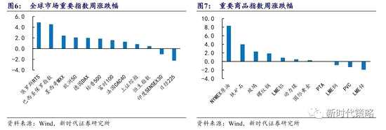 本周全球股市整體回暖,美股止跌反彈,歐洲及新興市場股市大幅反彈。標普500上漲1.86%。歐洲股市多數(shù)上漲,其中富時100指數(shù)上漲1.54%,歐洲50指數(shù)、德國DAX指數(shù)、及法國CAC40指數(shù)分別上漲2.05%、1.98%、1.25%。新興市場股市方面表現(xiàn)分化,俄羅斯RTS指數(shù)、巴西圣保羅指數(shù)和墨西哥MXX指數(shù)分別上漲4.87%、4.50%、2.40%。日經(jīng)225指數(shù)以及印度SENSEX30指數(shù)分別下跌2.26%、1.06%。商品市場中,原油價格伴隨美股反彈,NYMEX原油本周大漲8.29%,國際黃金價格微漲0.31%。有色板塊仍維持弱勢,LME鋅、銅繼續(xù)下跌1.88%、0.84%,LME鋁上漲0.89%。黑色系全面反彈,鐵礦石大幅上漲3.97%,螺紋鋼和動力煤分別上漲1.87%、0.50%。