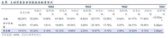 從2018Q4主動型基金配置變化來看, Q4加倉逆周期板塊,同時逆勢增配創(chuàng)業(yè)板和傳媒股,我們認為2019年春節(jié)后需要增加關(guān)注。截止1月24日,全部基金三季報已基本披露完畢。我們以普通股票型和偏股混合型共計1154只作為主動型基金研究樣本,發(fā)現(xiàn)2018Q4主板凈減倉1.69pct,中小板配置凈減倉0.69pct,創(chuàng)業(yè)板凈增倉2.38pct。分行業(yè)角度來看,增持的行業(yè)主要在具有逆周期性質(zhì)的中下游行業(yè),例如房地產(chǎn)(2.25pct)、農(nóng)林漁牧(1.46pct)、機械(0.69pct)、電力設(shè)備(1.43pct)、公用事業(yè)(1.23pct)等行業(yè)增持明顯;減持的行業(yè)主要集中在消費和上游周期行業(yè),例如食品飲料(-2.27%)、有色金屬(-1.05pct)、石油石化(-1.04%)、家電(-0.87pct)、鋼鐵(-0.37pct)、醫(yī)藥(-0.53pct)等。