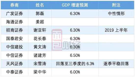 關(guān)于GDP的年內(nèi)增速變化趨勢(shì),大家的看法較為一致,多家券商認(rèn)為2019年上半年的經(jīng)濟(jì)增速可能會(huì)存在一定慣性下滑的壓力,但三季度開始企穩(wěn)。
