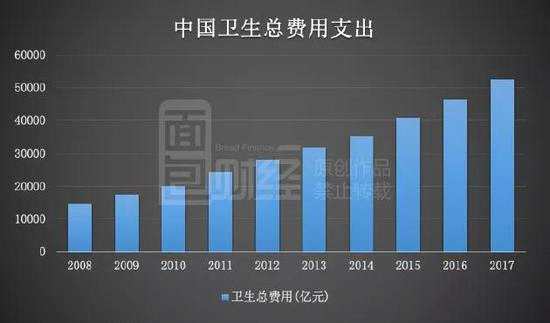 從官方統(tǒng)計(jì)數(shù)據(jù)上看:我國衛(wèi)生總費(fèi)用的支出絕對金額從2008年的14535.4億上升到了2017年的52598.28億,復(fù)合增速超過了15%。雖然近幾年受基數(shù)增大等因素的影響,增速有所降低,但仍然維持在10%以上。