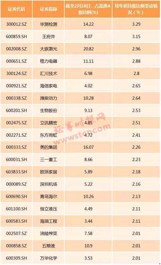 另外,Wind統(tǒng)計(jì)數(shù)據(jù)顯示,從占流通股的比例來看,今年以來(截至2月19日),20股的北上資金持股比例較年初增加2個(gè)百分點(diǎn)。其中華測檢測、王府井兩只個(gè)股增超3個(gè)百分點(diǎn)。