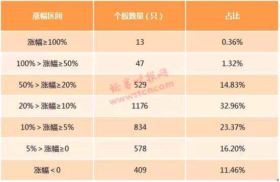 這也意味著,近九成的個(gè)股股價(jià)實(shí)現(xiàn)了上漲。其中,累計(jì)漲幅漲幅超過20%的共有589只,占比16.51%。