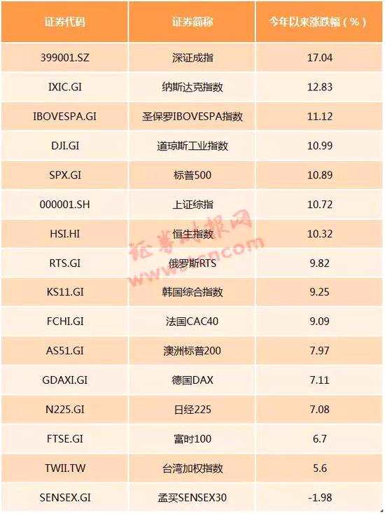 統(tǒng)計(jì)數(shù)據(jù)顯示,今年以來,在Wind全球重要指數(shù)中,深證成指以17.04%累計(jì)漲幅位居首位,而上證綜指累計(jì)漲幅為10.72%,位列第六。