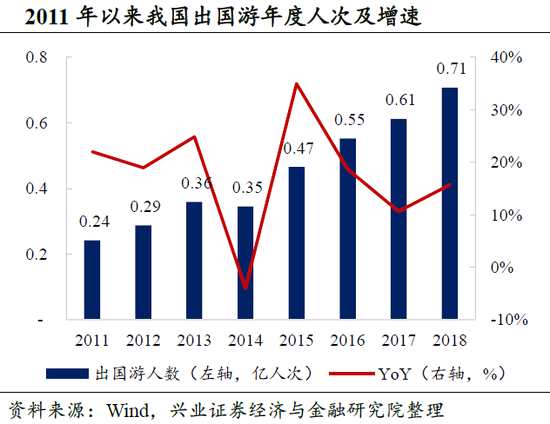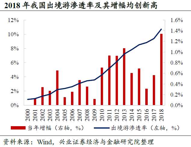 根據(jù)文旅部數(shù)據(jù)顯示,2018年我國出境游總?cè)藬?shù)14972萬人次,同比增長14.7%,增速創(chuàng)近四年以來新高,其中:2018年下半年增速為14.5%,較2018年上半年的15%有所放緩,但依然維持在較高水平;以當年出境游人次除以年末總?cè)丝谟嬎銤B透率,2018年出境游滲透率達到10.73%,較2017年大幅提升1.34個百分點,增幅創(chuàng)歷史新高。