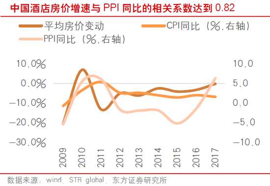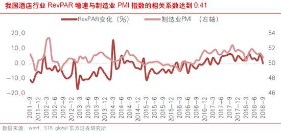 東方證券指出,酒店基本面與宏觀經(jīng)濟存在如下關(guān)系:①PMI對酒店行業(yè)經(jīng)營有預示作用。其中制造業(yè)PMI指數(shù)的相關(guān)性更強,是跟蹤判斷酒店行業(yè)運營狀況的先行指標;②GDP對酒店Rev PAR(每間可供租出客房產(chǎn)生的平均實際營業(yè)收入)的影響主要通過影響入住率來傳導。國內(nèi)酒店Rev PAR增速GDP增速相關(guān)性并不顯著,但入住率的變動與GDP增速的相關(guān)系數(shù)達到0.48,證明入住率所反映的需求側(cè)變動對GDP增長的敏感性更強,進而影響到酒店經(jīng)營;③價格指數(shù)對酒店Rev PAR的影響主要通過影響房價來傳導。國內(nèi)酒店Rev PAR增速與CPI/PPI同比的相關(guān)系數(shù)分別達到0.43/0.62,其中房價增速與CPI/PPI同比的相關(guān)性更高(相關(guān)系數(shù)分別為0.65/0.82);④民航客流增速對于入住率變動有著預示作用,當月民航客流增速有可能通過影響下個月商旅需求、進而影響酒店行業(yè)入住率。