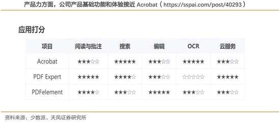 產(chǎn)品力方面,根據(jù)第三方機構(gòu),評測者橫向?qū)Ρ攘薃dobe Acrobat、PDF Expert和PDF element三款產(chǎn)品,產(chǎn)品力角度只略弱于Adobe Acrobat。而若考慮價格因素,選購PDF element性價比凸顯。標桿客戶方面,根據(jù)官網(wǎng),公司在海外客戶質(zhì)量高,包括東方匯理銀行等。天風證券看好公司銷售團隊未來完善后,向To B市場挺進。