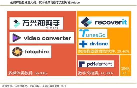 天風證券認為,萬興科技(300624.SZ)具備市場稀缺性和優(yōu)質(zhì)的商業(yè)模式,從To C到To B,潛在增量的市場為公司提供廣闊成長天地。根據(jù)公司官網(wǎng),公司產(chǎn)品包括多媒體與視頻、數(shù)字文檔管理、數(shù)據(jù)管理三大類。其中,視頻編輯和PDF文檔管理,直接對標Adobe部分產(chǎn)品線,如PDF element對標Adobe Acrobat。根據(jù)招股說明書,公司客戶目前以C端消費者為主,主要面向海外市場,絕大部分通過網(wǎng)絡(luò)渠道進行出售。根據(jù)Wind,2015~2017年公司平均毛利率超過90%,ROE超過25%。