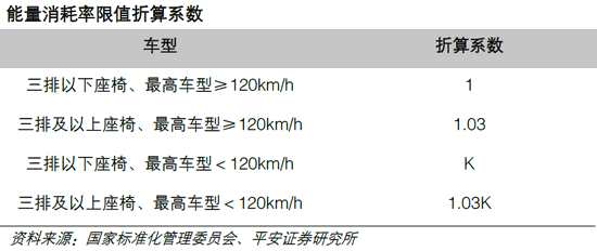 該標準適用于最大設(shè)計總質(zhì)量不超過3500kg的M1類純電動汽車,依據(jù)GB/T18386-2017工況法測試,第一階段將于2019年7月1日正式實施。平安證券根據(jù)現(xiàn)有進入2019年新能源車型推薦目錄的純電乘用車型進行驗證,80%車型滿足第二階段限值,100%車型滿足第一階段限值。因此該限值標準整體要求較為寬松。該限值標準以具備三排以下座椅、最高車速≥120km/h的車型為基準,并給予高運輸效率車型(具備三排及以上座椅)額外3%限值優(yōu)惠、給予限速車型(最高車速<120km/h)差異化折算K系數(shù)。