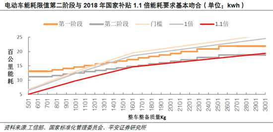 2017年至今純電乘用車技術(shù)水平顯著提升,能耗水平快速下降。參照2018年國家補貼政策的純電乘用車能耗要求,該標準要求整體較為寬松。其中第一階段將于2019年7月1日開始實施,根據(jù)標準標識說明,第一階段限值將用于新車型準入或新能源汽車補貼政策;第二階段限值可用于制定鼓勵少數(shù)先進車型的政策,或用于制定未來更長時間的新車型準入政策。平安證券以整備質(zhì)量500~3000kg為區(qū)間作圖,比較能量消耗限值與2018年國家補貼政策中純電乘用車能耗要求。