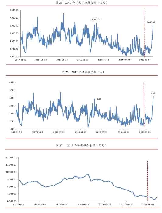 其次,從市場交易來看,市場活躍度有所改善,市場情緒逐漸回暖。從市場成交額來看,如圖25所示,2019年以來市場成交額呈現(xiàn)震蕩上漲趨勢。尤其是2月以來,市場成交額持續(xù)增加,市場量能明顯放大。從市場成交額的絕對數(shù)量來看,2月19日市場成交額突破6000億,為近半年內(nèi)的高點(diǎn)。雖然這一數(shù)據(jù)與牛市期間上萬億的成交額水平差距明顯,但較2018年市場成交額增加明顯,且增長迅速,反映出短期內(nèi)投資者投資交易意愿增強(qiáng)。從換手率來看,如圖26所示,2019年以來換手率走勢大致與市場成交額相同,2月19日市場換手率達(dá)到近一年的高點(diǎn)為3.09%,這同樣反映出當(dāng)前市場活躍度較2018年有所提升。從信用交易活躍度來看,如圖27所示,2019年融資融券余額呈現(xiàn)先降低后增加的趨勢,但整體而言處于2017年以來的低位,這一指標(biāo)反映出2018年股指大幅下行抑制了投資者通過信用交易方式參與市場交易,且當(dāng)前投資者對于加杠桿炒股的態(tài)度可能較為謹(jǐn)慎,但同時也反映出當(dāng)前市場還可能存有上行空間。從新發(fā)行的基金數(shù)額來看,如圖28所示,2019年1月基金發(fā)行數(shù)額較低,但考慮基金有建倉期,2018年10月發(fā)行的基金數(shù)額較大且可能在今年會進(jìn)入市場參與交易,這也在一定程度上為市場提供了增量資金。
