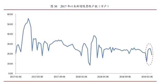 再次,從投資者參與意愿來看,投資者參與意愿依然不足。如圖30所示,2019年以來新增投資者數(shù)量呈現(xiàn)新增后減的趨勢,且并未突破前期的高點(diǎn),這表明了當(dāng)前場外投資者入市意愿較低,對待市場的態(tài)度以觀望為主。但可以預(yù)計(jì)的一點(diǎn)是,隨著近期市場行情回暖、內(nèi)部政策趨向溫和以及外部條件向樂觀方向改善,未來市場中新增投資者的數(shù)量可能會有所增加。從投資者參與意愿來看,當(dāng)前市場投資者入市意愿不足,投資者參與意愿特征可能更與非牛市時期的特征相符合。但未來隨著市場行情的演繹、政策趨向溫和以及外部環(huán)境改善,可能會吸引部分場外投資者進(jìn)入市場投資,投資者的參與意愿可能會有所增加。