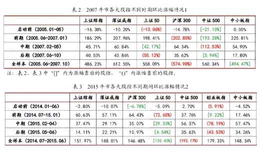 將2007牛市和2015牛市時期劃分的情況總結(jié)如下表(表1)所示: