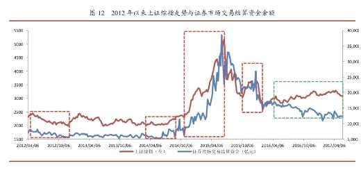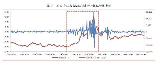 牛市過程中伴隨著證券市場交易結(jié)算資金余額的持續(xù)走高,而證券市場交易結(jié)算資金余額先于上證綜指見頂。從圖12中可以看到,隨著上證綜指不斷走高,證券市場交易結(jié)算資金余額也不斷攀升。此外,從圖中也可以看到,證券市場交易結(jié)算資金余額先于上證綜指見頂,證券市場交易結(jié)算資金余額在短時間內(nèi)從階段高位快速降低后,上證綜指也會出現(xiàn)較大幅度的下跌。因此,可將證券市場交易結(jié)算資金余額在高位快速下跌作為股指走低的前兆之一。