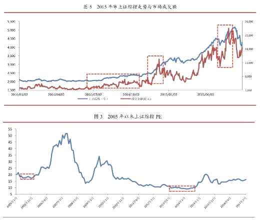 牛市后期,市場交易額持續(xù)放大并保持高位運(yùn)行,市場成交額先于上證綜指見頂。從圖4、圖5中可以看到,在牛市后期,隨著更多的投資者參與到市場交易之中,市場活躍度較高,市場交易額持續(xù)放大并保持高位運(yùn)行。另外,從圖4、圖5中也可以看到,2007和2015牛市的成交額均先于上證綜指見頂,表明成交額是股指持續(xù)上漲的重要支撐。而成交額在牛市后期達(dá)到天量高點(diǎn)后開始回落,可看作是牛市缺乏繼續(xù)上行動力的標(biāo)志之一。