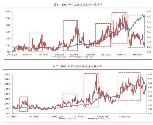 換手率最高點(diǎn)多出現(xiàn)在牛市中期后半段。2007牛市換手率最高為2007年5月30日的8.07%,2015牛市最高點(diǎn)為2014年12月9日的9.40%。此外,2015年5月28日的換手率也高達(dá)9.34%,表明隨著牛市基調(diào)確立,此時有更多的投資者參與到市場交易之中,從而使得換手率創(chuàng)出新高點(diǎn)。