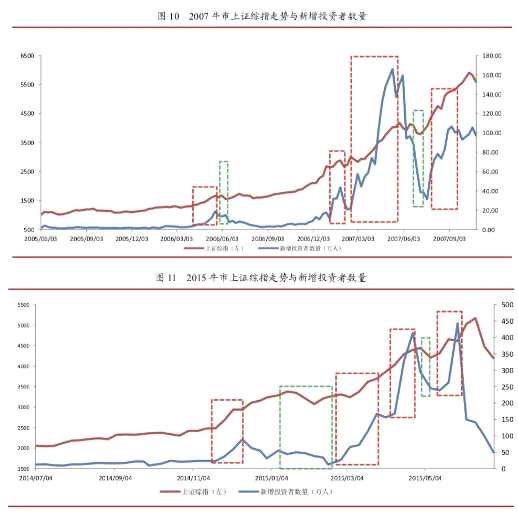 新增投資者數(shù)量與上證綜指間具有正相關(guān)關(guān)系。從圖10、圖11中可以明顯看到,隨著投資者數(shù)量增加速度加快,上證綜指出現(xiàn)明顯上漲,在牛市后期這種現(xiàn)象尤為明顯。而隨著新增投資者數(shù)量增加速度的下降,上證綜指則對應(yīng)出現(xiàn)下跌趨勢。這種現(xiàn)象主要與A股市場的交易由散戶主導(dǎo)、交易的投機(jī)性較強(qiáng)的結(jié)構(gòu)特征有關(guān)。