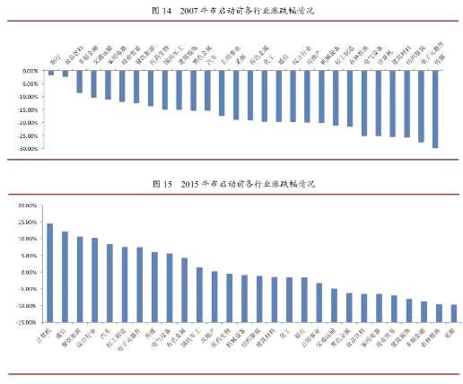 2005年1月-5月和2014年1月-6月的兩次牛市啟動前,各板塊漲幅都不明顯,且超過半數(shù)的板塊都處于下跌狀態(tài)。如圖14所示,2007牛市啟動前無行業(yè)實(shí)現(xiàn)上漲,其中銀行、非銀金融、食品飲料以及建筑裝飾等行業(yè)跌幅較??;2015牛市啟動前大部分行業(yè)下跌,如圖15所示,上漲的行業(yè)僅有12個,其中計(jì)算機(jī)、通信、電子元器件以及傳媒等行業(yè)漲幅靠前。