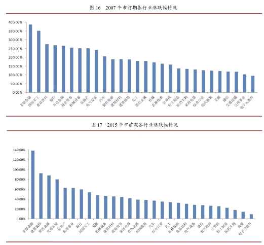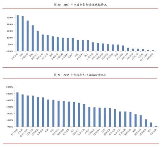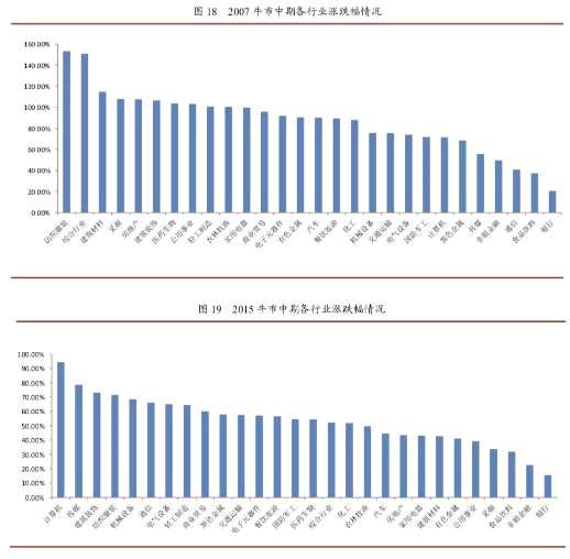 根據(jù)前面對于牛市不同時期的劃分,分別計(jì)算2007牛市和2015牛市中28個申萬一級行業(yè)在每個時期的漲跌情況,并對漲幅靠前和靠后的行業(yè)進(jìn)行比較分析,得出在牛市不同階段的行業(yè)變化情況,據(jù)此分析牛市的階段性特征。