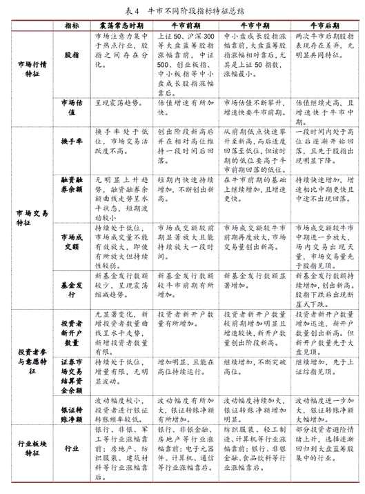 如前所述,在牛市的不同階段,各類指標(biāo)呈現(xiàn)出不同的特點(diǎn),表4對此進(jìn)行了梳理歸納。表4的這些指標(biāo)變動可為投資者判斷牛市所處的階段和制定具體的投資決策提供一些有用信息。