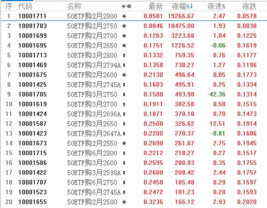今日A股市場(chǎng)暴漲,50ETF購(gòu)2月2800在今日也漲幅驚人,漲幅高達(dá)19267%,另外50ETF購(gòu)2月2750今日漲幅也達(dá)道了驚人的10475%。