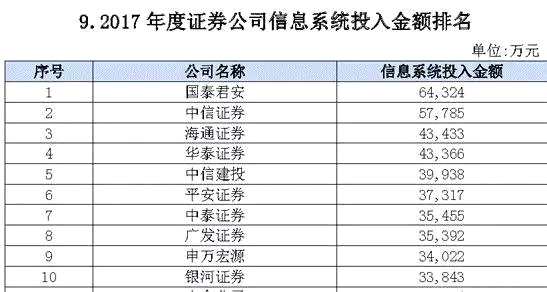 從排名可以看出,僅前10名券商在2017年的信息系統(tǒng)投入金額就達到42.49億元。其中國泰君安和中信證券分別達到6.43億元和5.78億元,海通、華泰投入金額也超過4億元。