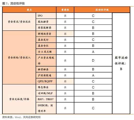 下表選取關(guān)乎股市流動性的15個指標(biāo),強指標(biāo)10分,ABCDE分別對應(yīng)10分、8分、6分、4分、2分;弱指標(biāo)減半,ABCDE分別對應(yīng)5分、4分、3分、2分、1分(則滿分140分,最低28分)。最終通過加權(quán)來獲得綜合評級。