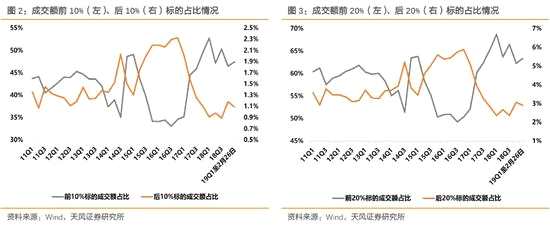 在此前的流動性報告中我們曾經(jīng)討論過交易集中度的問題,16-17年市場風(fēng)格“以大為美”,加上18年的流動性危機,市場的分化越來越顯著。一方面,在真實的業(yè)績上,尾部公司爆雷風(fēng)險增加;另一方面,在市場的選擇上,交易趨于擁擠。年初以來市場在政策呵護(hù)、資金流入預(yù)期、外部風(fēng)險緩解等因素下進(jìn)行估值修復(fù),但從成交集中度來看,也并非雞犬升天。我們以季度為單位統(tǒng)計11年以來的數(shù)據(jù)可以看到,年初至今,交易集中度仍處在過去幾年的高位,且略高于去年四季度。這一點同15年二季度的牛市有一定區(qū)別。