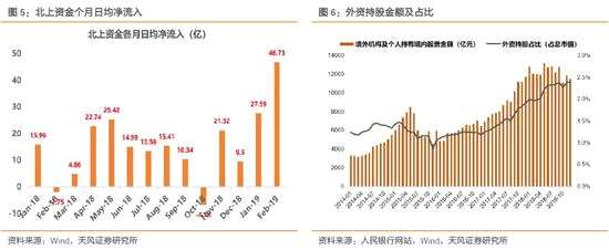18年的弱市,在MSCI、富時羅素、標(biāo)普納入的激勵下,外資持續(xù)地逆市流入。從表面數(shù)據(jù)上看,我們統(tǒng)計18年以來各月北上資金日均凈流入,今年1月和2月的數(shù)據(jù)是最高的。但需要注意的是,僅看凈流入數(shù)據(jù)無法完全剔除股價變動帶來的影響。即使只看單日凈流入指標(biāo),也能發(fā)現(xiàn)外資并非一成不變地買入。周一上證大漲5.6%的時候,外資卻是凈流出的。