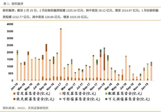 其他我們重點關(guān)注的指標(biāo)里:截至2月25日,2月份股權(quán)融資規(guī)模1325.34億元,其中首發(fā)29.12億元,增發(fā)1014.97億元;1月份股權(quán)融資規(guī)模1212.77億元,其中首發(fā)126.86億元,增發(fā)1015.30億元。截至2019年2月25日,2月并購重組計劃上市6家(其中通過2家,待表決4家),通過率33.33%;1月并購重組計劃上市7家(其中通過5家,未通過2家),通過率71.42%。
