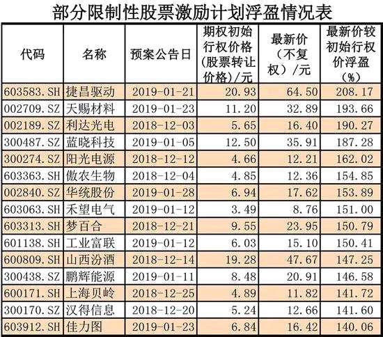據(jù)上證報(bào)資訊不完全統(tǒng)計(jì),2018年12月份以來推出的限制性股票激勵(lì)計(jì)劃中,目前賬面浮盈超過150%的公司還有傲農(nóng)生物、陽(yáng)光電源、夢(mèng)百合、藍(lán)曉科技、工業(yè)富聯(lián)、天賜材料、華統(tǒng)股份等。